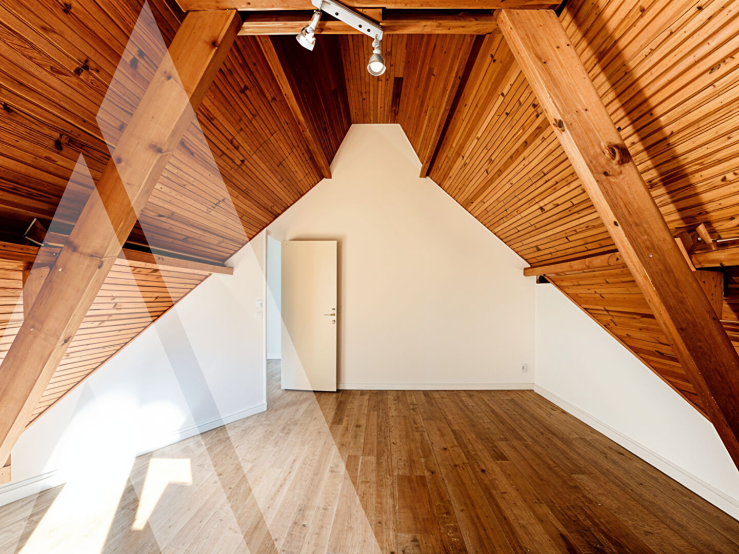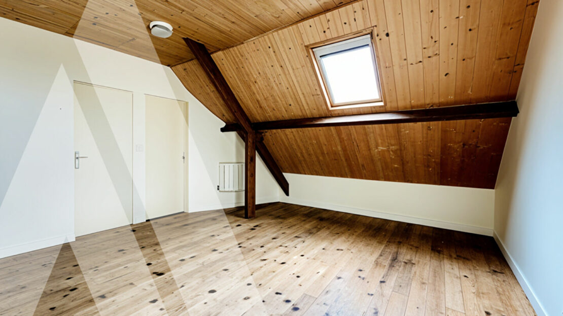 A l’étage, un grand palier mène à deux chambres, ainsi qu’à une pièce de 25 m² à aménager selon vos besoins (chambre supplémentaire, salle de jeux, bureau…), actuellement un grenier. Une salle de bains avec WC complète l’étage.
